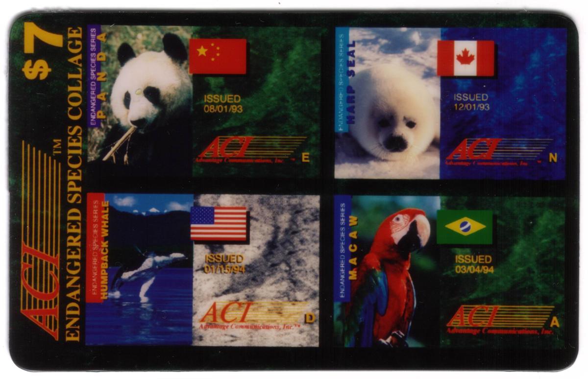 Text present on the phone card includes “Endangered Species Collage” and a price indication of $7. The acronym "ACMI" appears on the card, likely representing the issuing or manufacturing entity. The card's SKU is 10002, as referenced in the information provided. The layout combines the animals and flags in a balanced and visually harmonious way without overlapping or cluttering the main subjects.