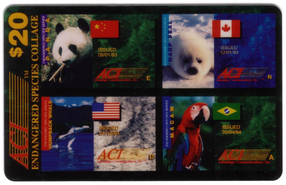 The card features American flags, along with the flags of China, Canada, and Brazil, signifying the international range of these endangered species or their respective regions. The vibrant colors of the flags add a patriotic and global theme to the overall design. The denomination “$20” is clearly indicated on the card, emphasizing its value for use as a phone card.