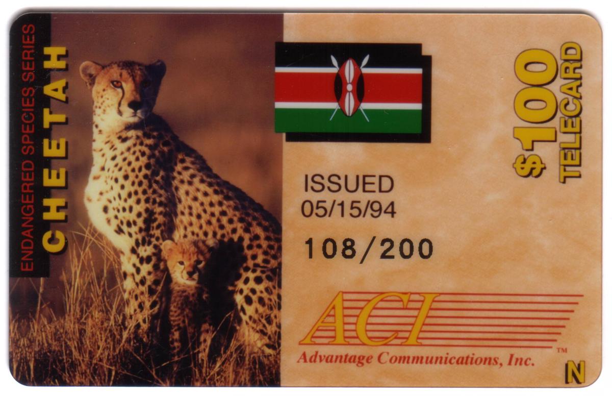 The card’s value is printed as $100 in the lower left area. Near the top left, the text “Endangered Species” and “Kenya Flag” appear, linking the image of the cheetah to its conservation status and national significance. The acronym “ACMI” is present, indicating the issuer or series connected to this collectible item.