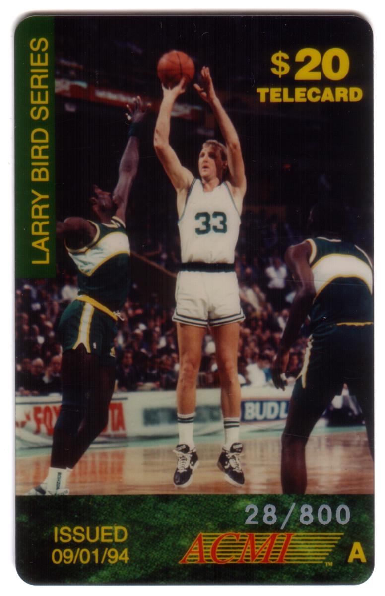 The card carries the SKU number 10474 and the value “$20” printed on it, which is an important detail for collectors regarding its market or issue value. It also contains abbreviations such as “ACMI,” which could refer to the issuer or an official authentication mark. The combination of the Boston Celtics team name, Larry Bird’s image, and the NBA acronym firmly ties this card to professional basketball memorabilia.