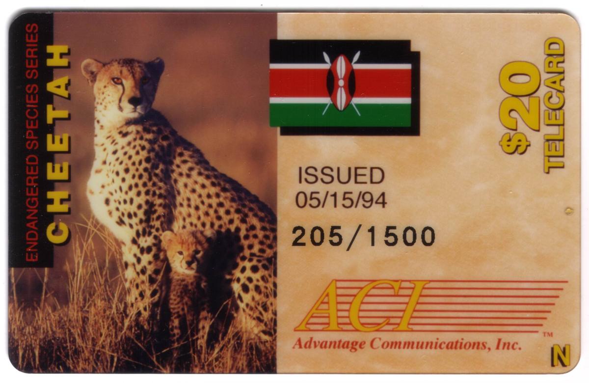 Text elements include the value "$20" printed clearly on the card. The card name “Cheetah Endangered Species & Kenya Flag” is identified by the SKU number 10494. The presence of “ACMI” printed on the card confirms the issuer or series related to this collectible phone card.
