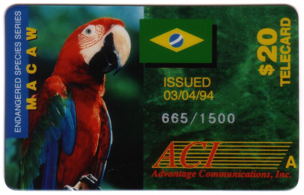 Limited edition $20 card featuring a vibrant macaw, Brazilian flag, and wildlife conservation themes, issued in 1994 as part of the Endangered Species Series.
