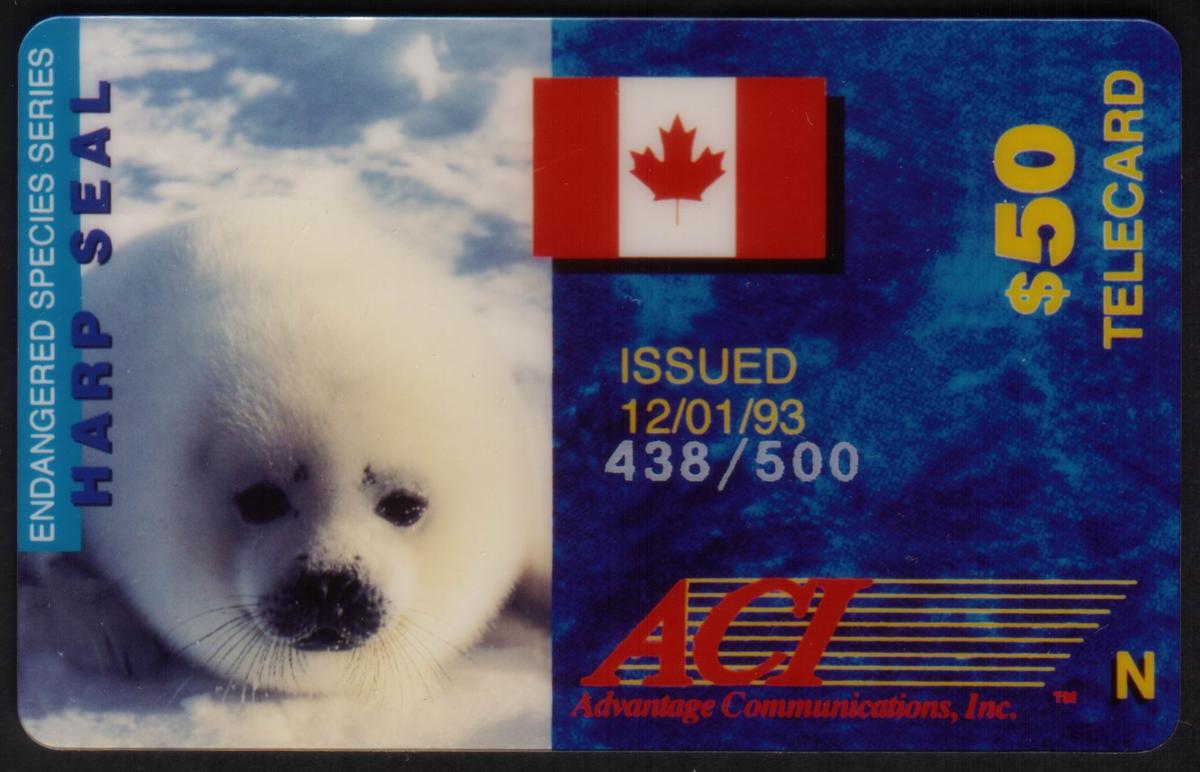 The card includes text on the lower right side that reads "Harp Seal Endangered Species & Canadian Flag," which directly identifies the animal depicted and connects it to the theme of endangered species. Additional text at the top right corner shows the value "$50," indicating the card’s denomination. The acronym "ACMI" is printed below the value, referring to the issuer or series related to this card. This card relates to wildlife and seafaring life of Canada with a strong conservation theme.
