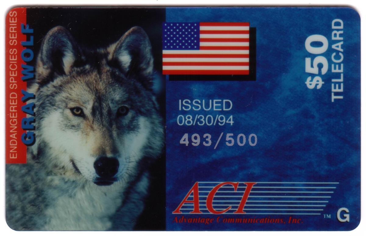 Limited-edition $50 Advantage Communications Gray Wolf telecard featuring endangered species, American flag, and patriotic design, issued August 30, 1994.