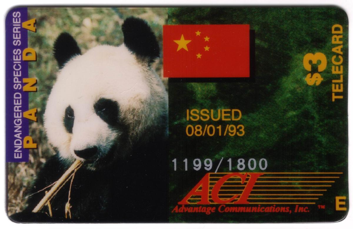 Panda-themed card featuring a close-up of a giant panda, Chinese flag, issue date 1993, $3 value, serial 1199/1800, highlighting wildlife conservation.