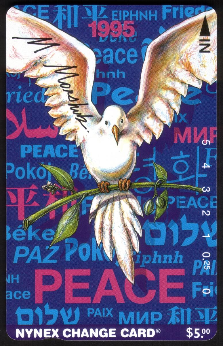 The front of the card displays the text "NYNEX World Peace 1995 Holiday Peace Card" along with the words "Season’s Greetings" in elegant typography. The design is signed by the artist, adding an element of authenticity and artistic value. The overall composition blends holiday spirit, art, and messages of peace, making it a unique piece connected to NYNEX, a New York telecommunications company.