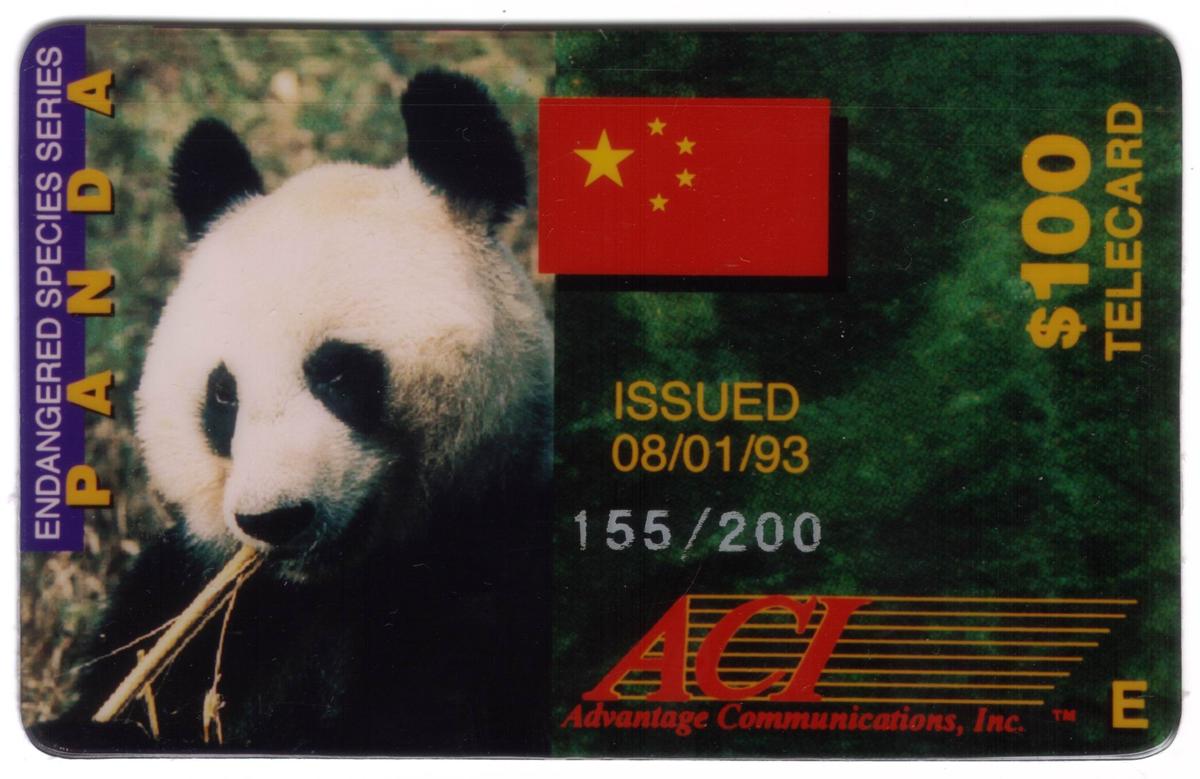 The card’s background uses earthy tones complemented by green bamboo stalks and leaves, which reinforces the panda’s natural habitat in the wild. In the lower right corner, the denomination "$100" is clearly printed in red. Additionally, the card contains a logo with the letters "ACMI," which ties it to an official authorization or association relevant to collectible cards.