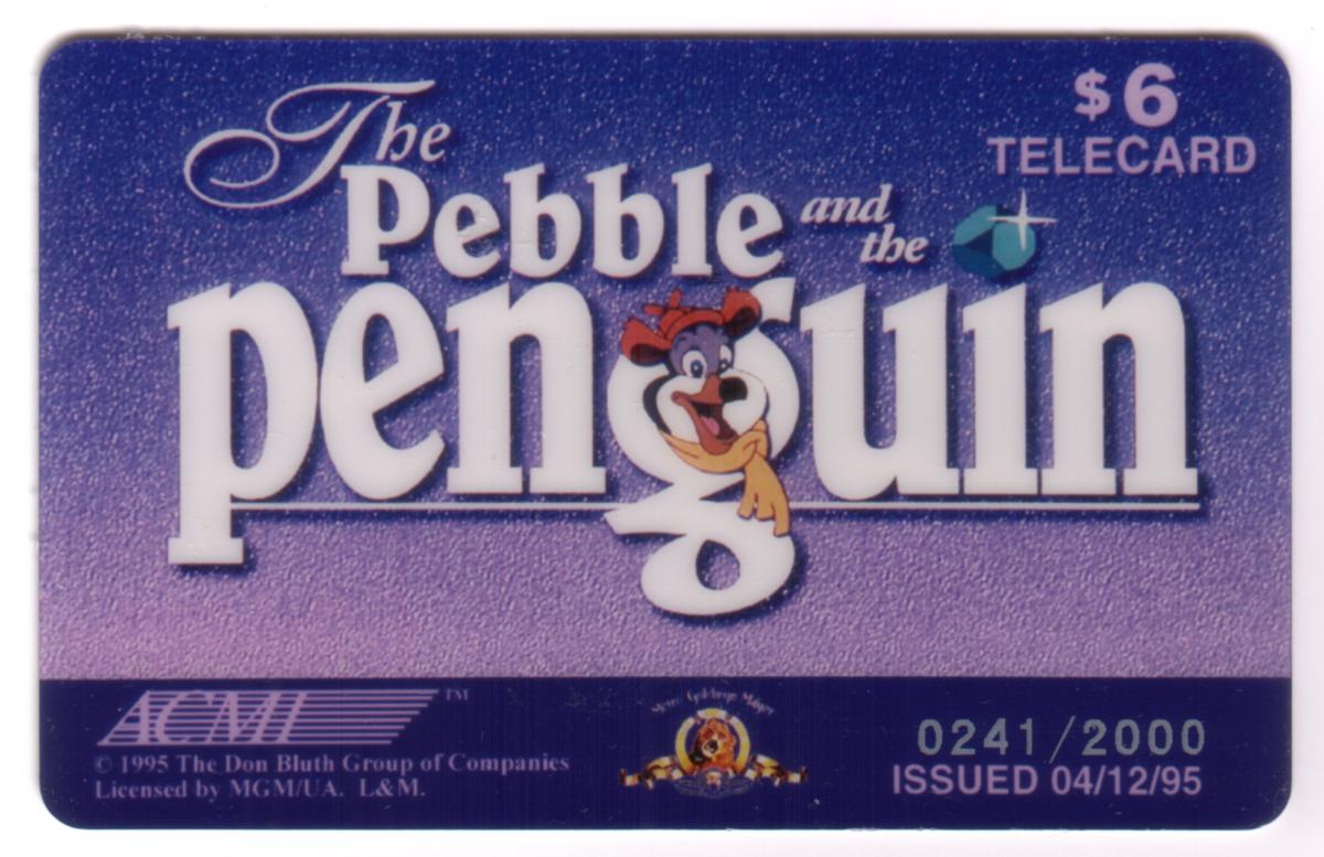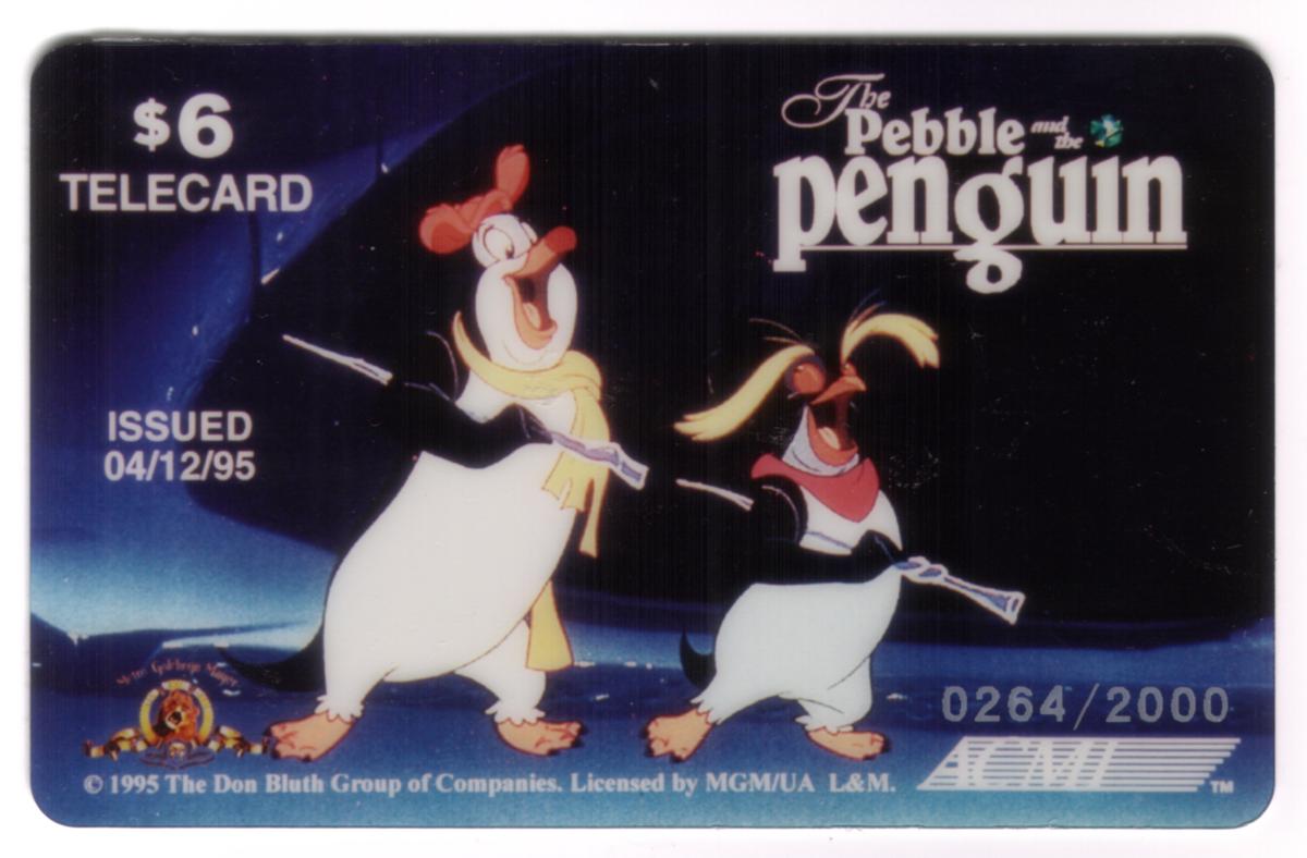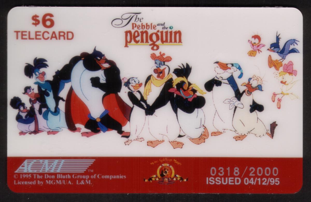 These three collectible $6 telecards are promotional items for the movie "The Pebble and the Penguin," released in 1995 and licensed by MGM/UA L&M and The Don Bluth Group of Companies. Each telecard includes the ACMI logo and the issue date of 04/12/95, indicating their release as a limited edition set, with individual numbering out of 2000 copies.