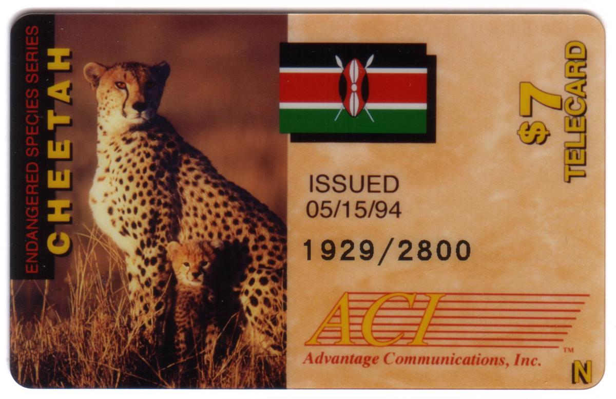 The card contains multiple logos and text in its design. In the upper left corner, the word "ACMI" is printed in bold black letters. Below "ACMI" is the denomination "$7" printed in green, indicating the card’s value. Above the cheetah, the phrase “Endangered Species” is clearly visible in black font, emphasizing the conservation status of the animal depicted. The lower right corner shows the word “KENYA” in capital letters with a yellow background, identifying the country represented by the flag.