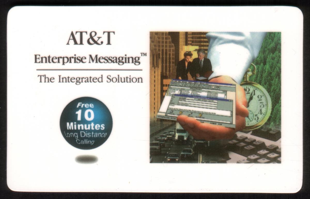 This collectible card features promotional artwork for AT&T Enterprise Messaging, highlighting "The Integrated Solution" for communication technology. The design includes the AT&T logo and text emphasizing free 10 minutes of long-distance calling.