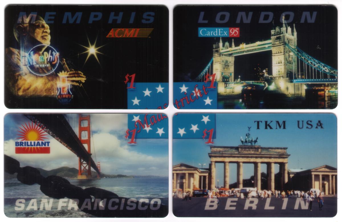 This set of four collectible phone cards features iconic landmarks and cultural references from different cities, each with a $1 value denomination prominently displayed on the front.