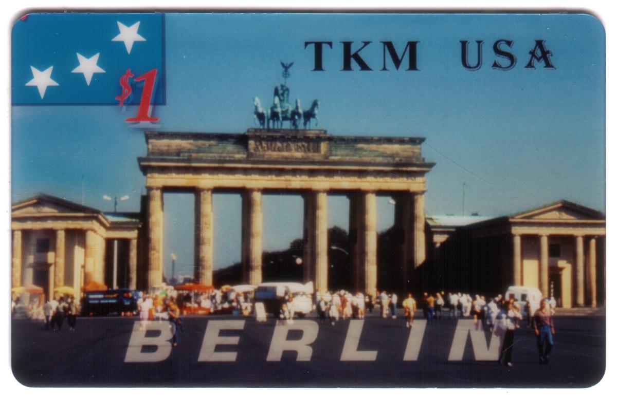 The fourth card presents the Brandenburg Gate, a historic monument in Berlin. The structure is bathed in daylight with numerous people visible in the plaza before it. The card carries the text "BERLIN" prominently across the bottom and the inscription "TKM USA" near the upper right corner.