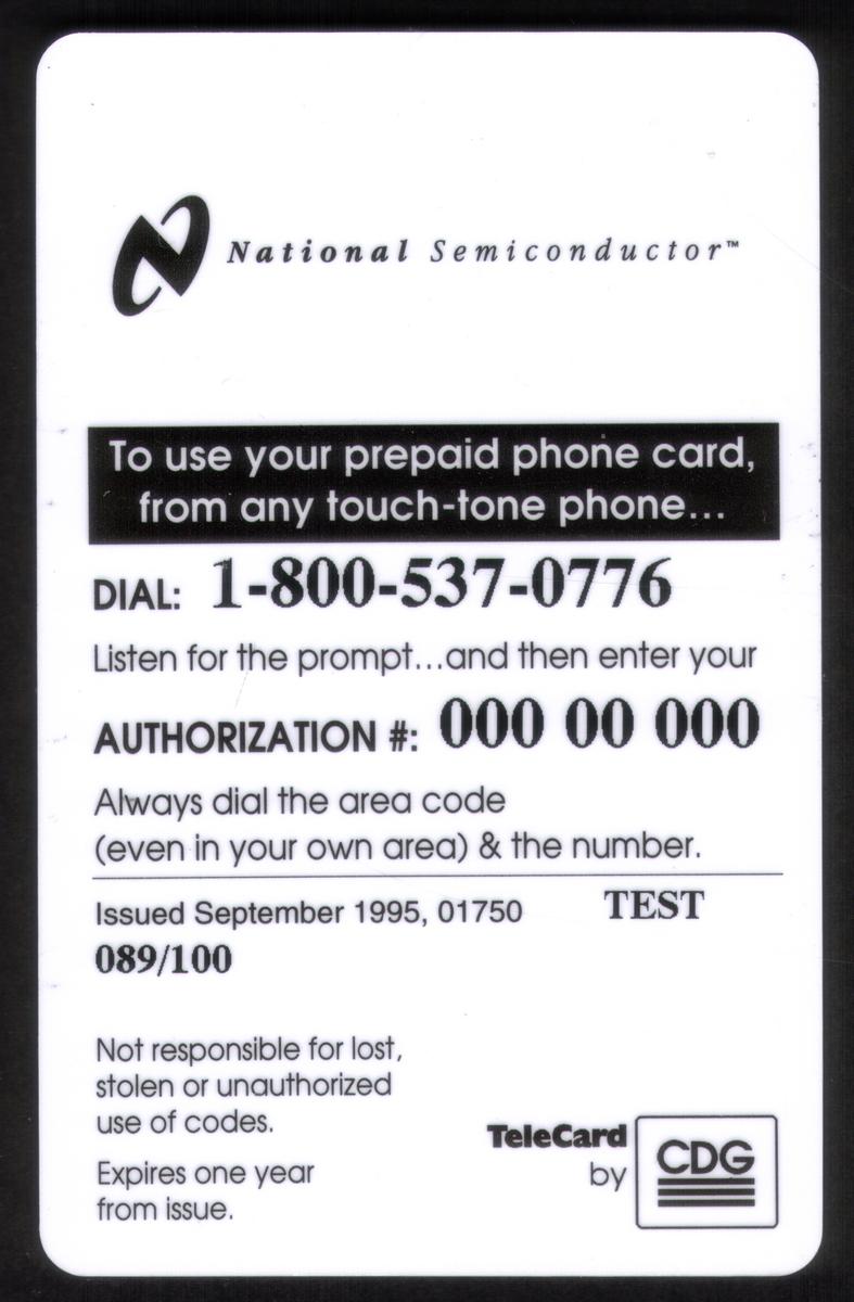 This phone card is linked to National Semiconductor and promotes prepaid long-distance calling with a ten-minute free call feature. The combination of the logos, website, and text firmly associates the card with National Semiconductor's corporate identity and communications technology services.