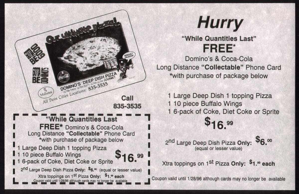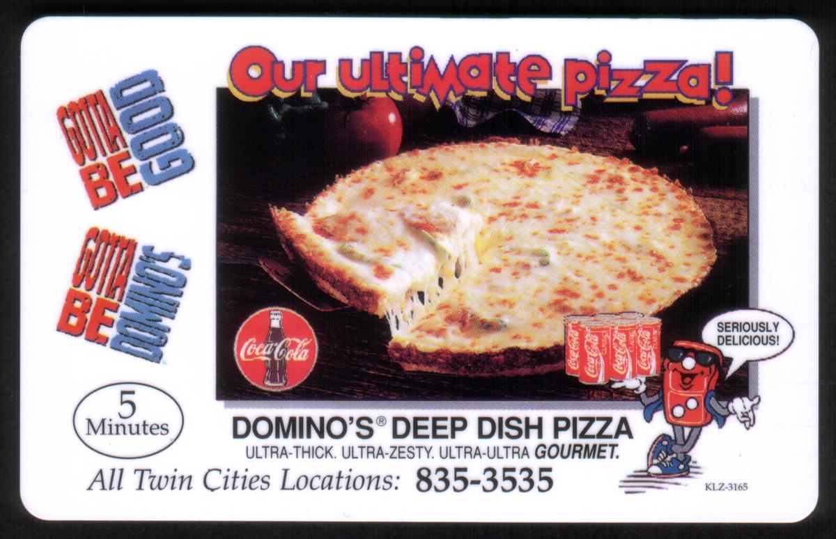 Coca Cola, cocacola, food, restaurants, dominos, gotta be good, our ultimate pizza, domino's deep dish pizza, coke cans, ultra-thick, ultra-zesty, ultra-ultra gourmet, all twin cities locations, always coca-cola, gotta be domino's, Ascot, Inc.