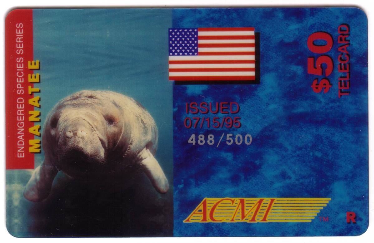 Additional text appearing on the card includes the acronym “ACMI,” which is placed near the lower right corner, representing the issuer or manufacturer of this phone card. The background depicts an underwater scene evoking the aquatic habitat of the manatee. The card’s overall design emphasizes American wildlife and conservation themes.