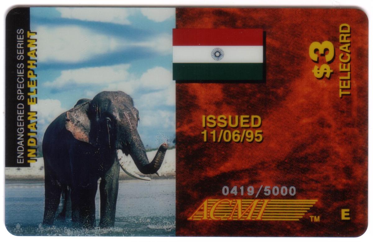 The card also contains text identifying the subject matter, including “Indian Elephant Endangered Species” and “India Flag.” The top portion displays the acronym “ACMI,” which likely represents the issuing organization connected to the card. Overall, the card combines themes of wildlife protection with national pride through visual and textual elements.