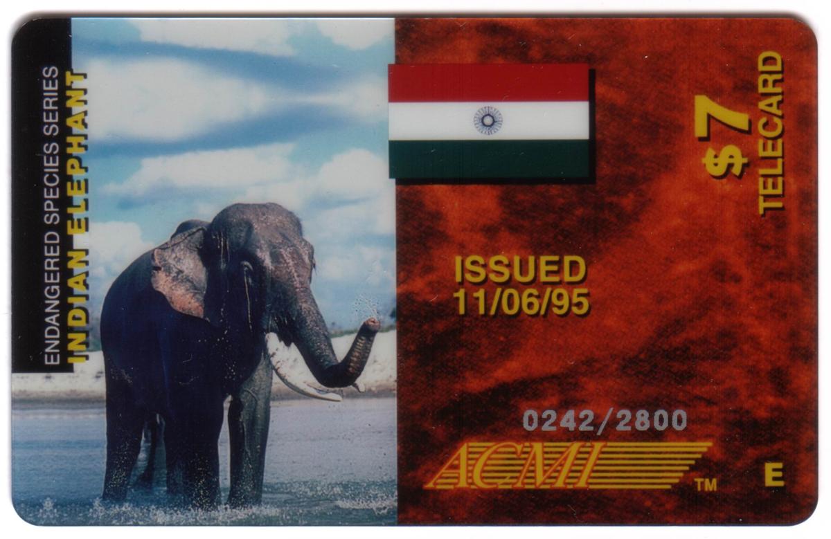 The card includes the text “Indian Elephant Endangered Species” and “India Flag” printed on the front. The name “ACMI” appears on the card, indicating the organization or issuer associated with this phone card. The card’s value is denoted as $7, which is printed clearly near the bottom edge.