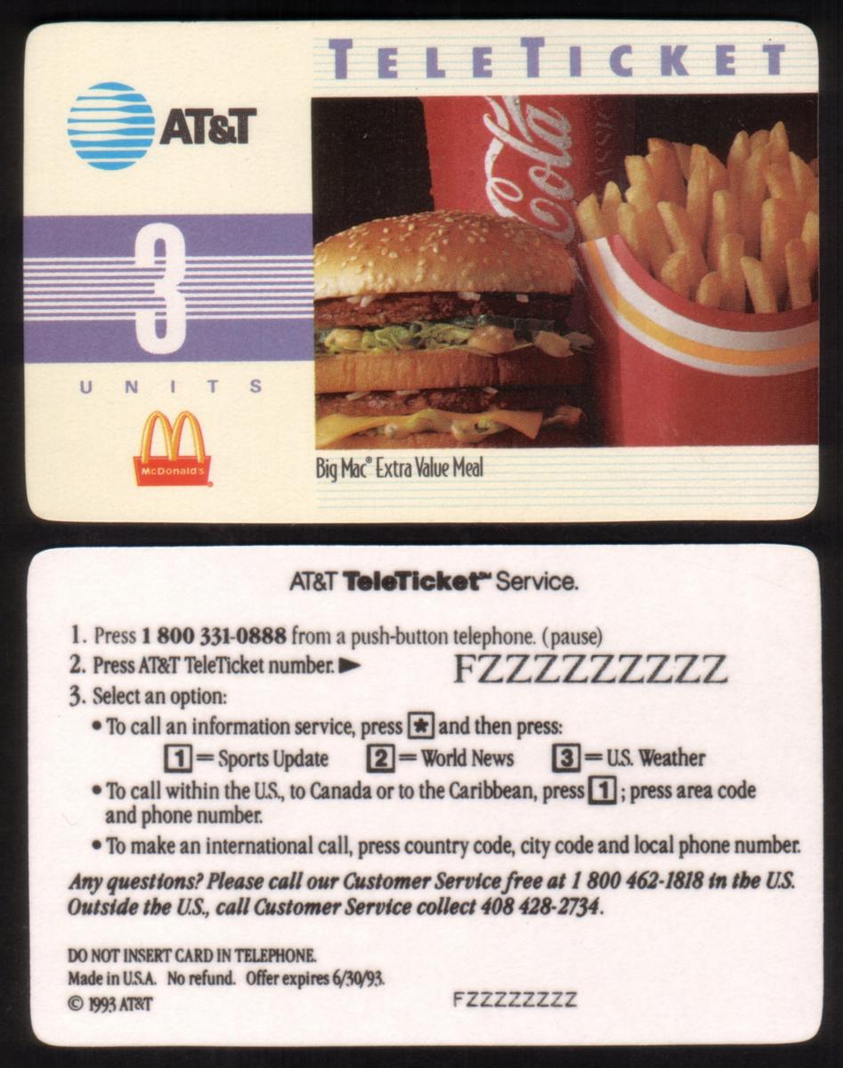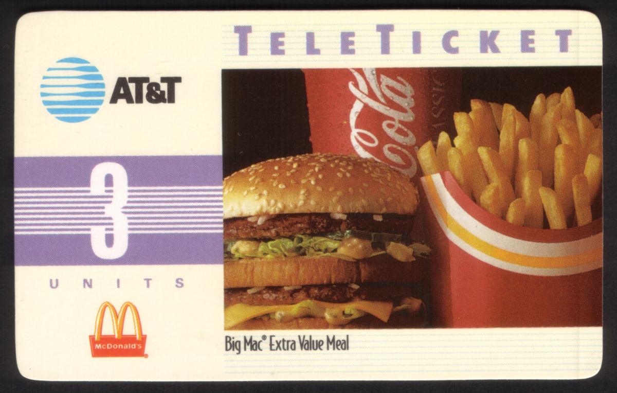 Collectible AT&T TeleTicket featuring a Big Mac meal, fries, Coca-Cola cup, and branding, with 3 call units, nostalgic 1990s fast-food and telecom imagery.