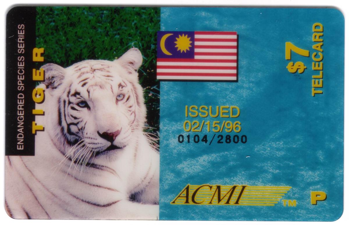 Limited edition white tiger prepaid card featuring Malaysia flag, conservation theme, serial number, and $7 value for collectors and wildlife awareness.