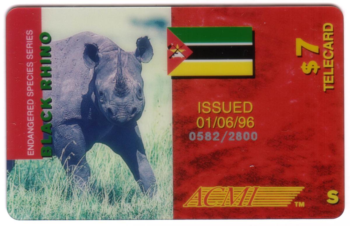 Endangered Species Series black rhino phone card with Mozambique flag, $7 denomination, issued in 1996, featuring wildlife imagery and collectible details.
