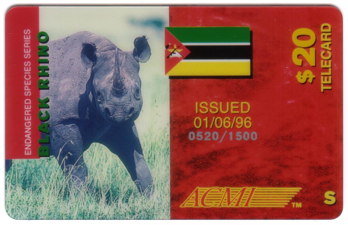 Black rhinoceros in grassy habitat, Mozambique flag, $20 value, limited edition serial 0520/1500, ACMI branding, highlighting endangered species awareness.