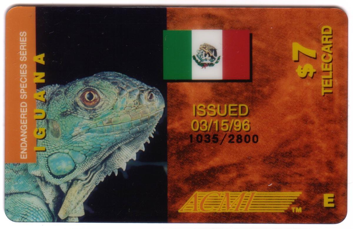The card includes the text "Iguana Endangered Species & Mexico Flag" along with the acronym ACMI. The background is neutral, focusing attention on the iguana and the flag. The overall design emphasizes the importance of wildlife conservation, particularly for the iguana, and represents Mexican national identity through the flag. The card is valued at $7 and is associated with the keyword themes of animals, lizards, iguanas, flags, reptiles, and wildlife.