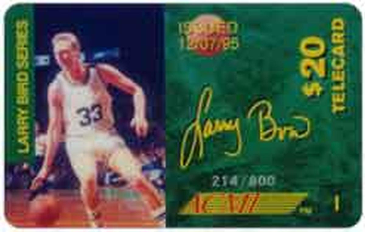 The background of the card is a solid green color, with white and yellow text providing details about Larry Bird and the card issue. The top left corner has the Boston Celtics logo, while the bottom right contains the NBA logo. The card includes official markings from ACMI, the issuing company. The number "20" is specified on the card, but no details related to jersey numbers or helmet numbers are present.
