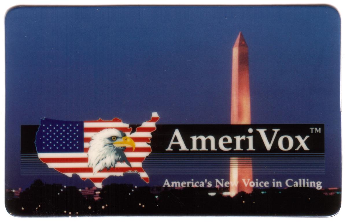 Denominations of $10 and $100 are printed on the lower left corner of the card, indicating its value for phone use. The card is marked with the date 6/93 and the name "AmeriVox," identifying the issuer. The overall design uses patriotic colors red, white, and blue, consistent with the themes of Americana and US maps seen in the imagery and text.