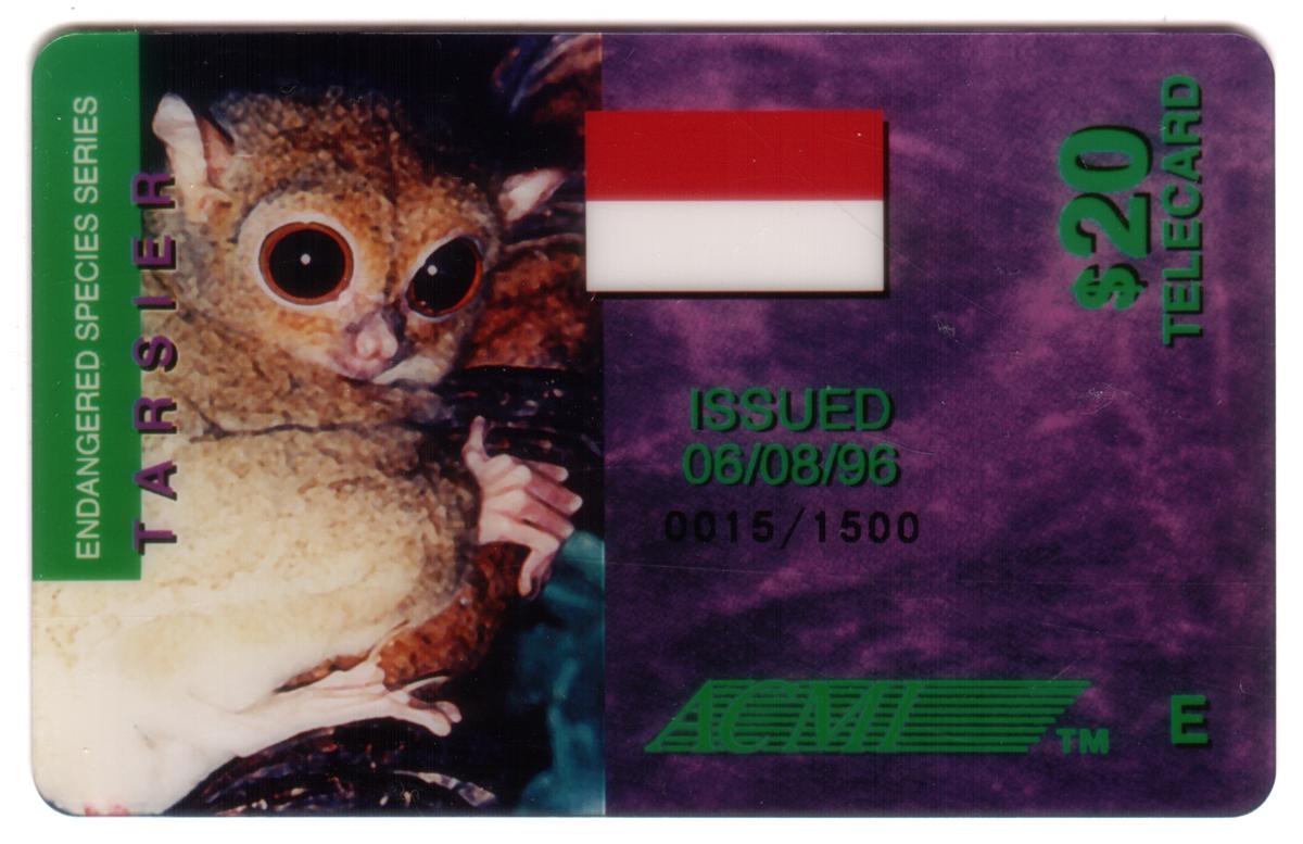 This collectible chip card features a detailed photographic image of a tarsier, a miniature primate known for its large eyes and small body. The tarsier is shown perched on a tree branch amid green foliage. The card highlights the tarsier as an endangered species and emphasizes its connection to wildlife conservation.