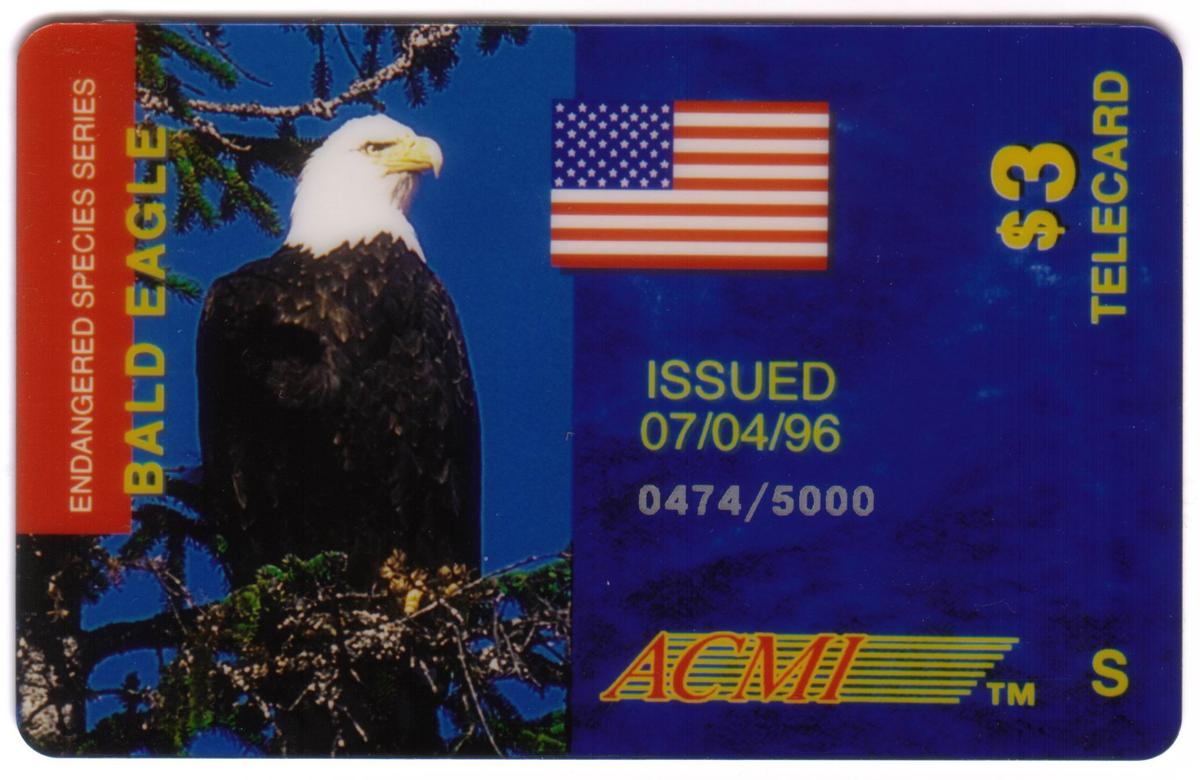 At the bottom and near the lower right edge of the card, the acronym “ACMI” appears in white text, identifying the issuing or certifying organization. The card’s overall design emphasizes Americana, wildlife, and birds, honoring the iconic symbol of the United States. The combination of the American Bald Eagle and the flag creates a striking representation of national pride and wildlife preservation.