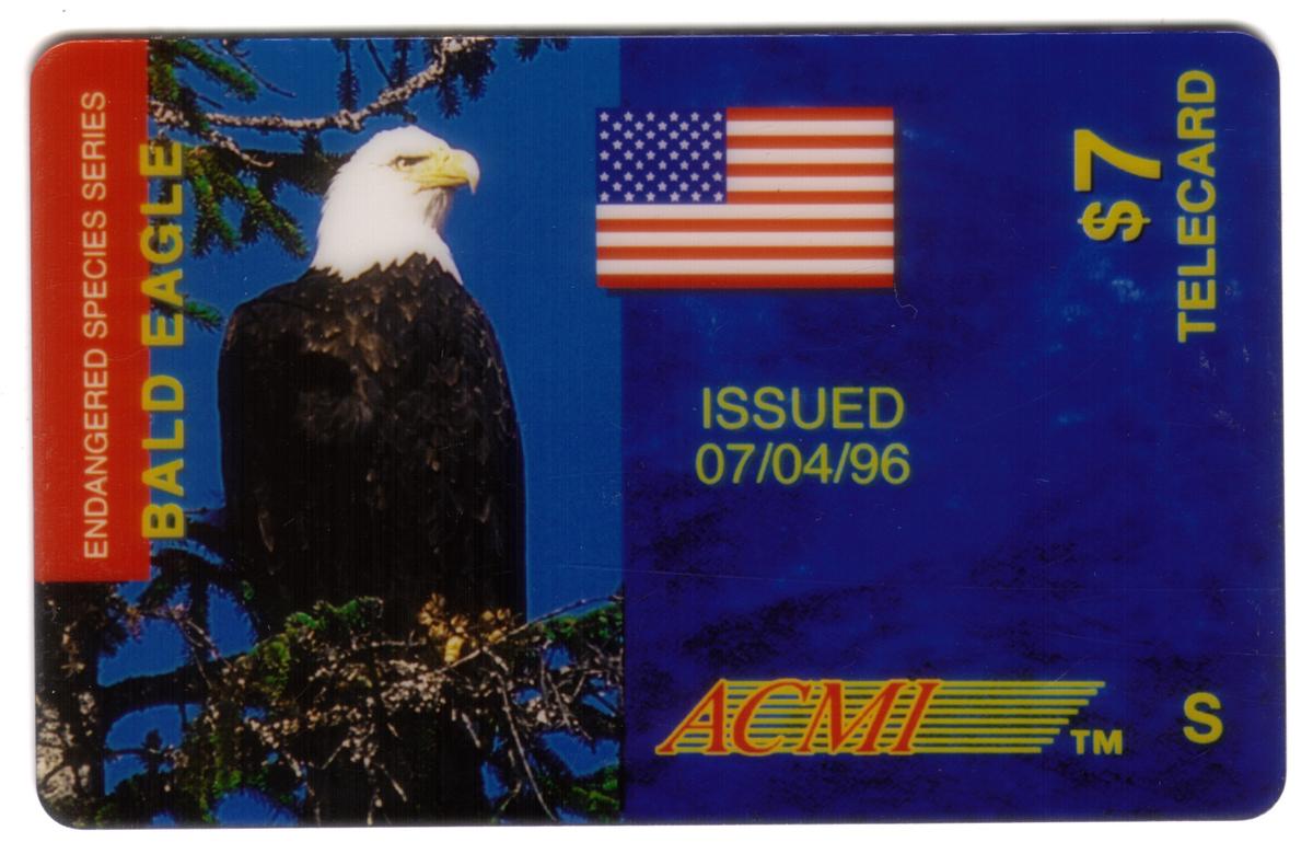 Printed on the card are the phrases “American Bald Eagle Endangered Species” and “USA Flag,” along with a denomination of $7. The label “PROOF” appears clearly on the front, indicating the card’s production type. The bottom right corner carries the marking “ACMI,” identifying the issuing or manufacturing entity. This card represents a collectible themed around American wildlife and patriotism.