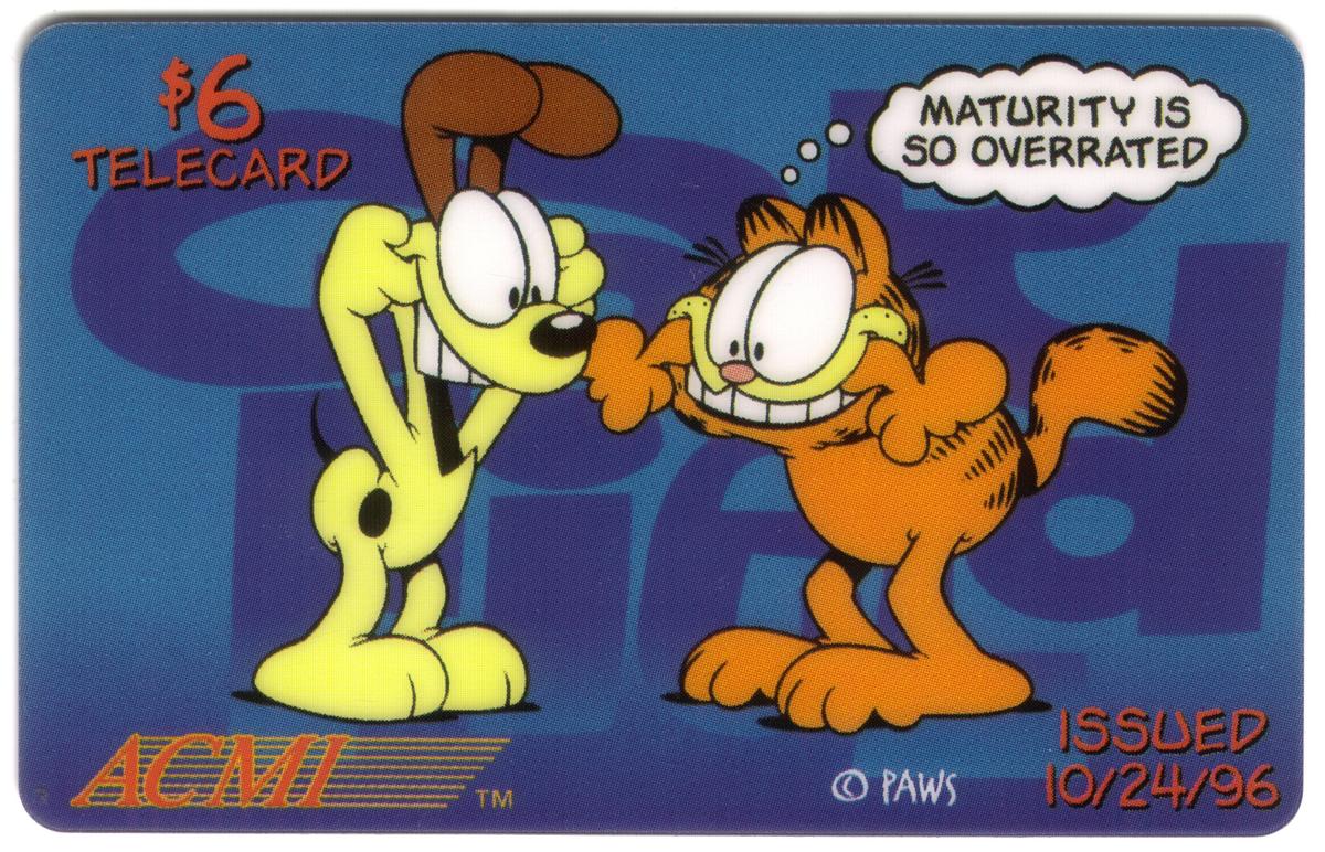 This phone card is associated with the ACMI collection. The visual theme centers on animation, cartoons, and comic characters, specifically focusing on cats and animals through the well-known Garfield franchise.