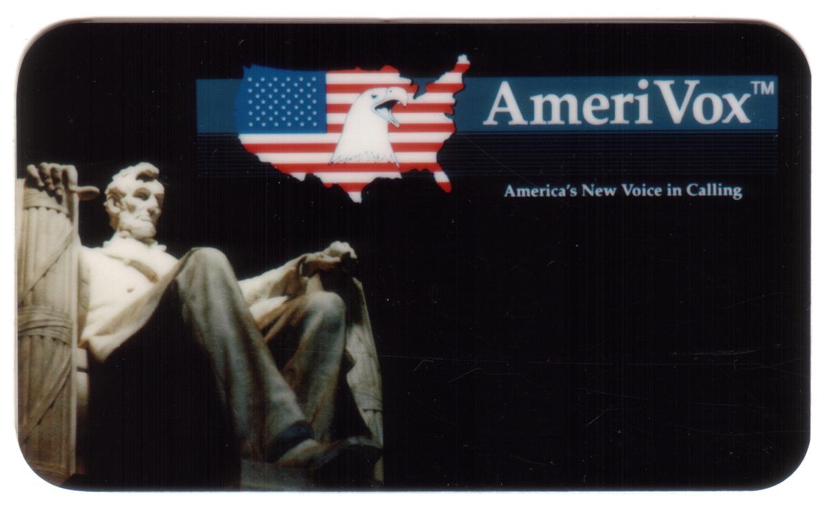 In the upper right corner, the card displays the AmeriVox logo consisting of a stylized map of the United States filled with an American flag pattern, including stars and stripes. A white bald eagle with an open beak is superimposed over the map. Below the logo, the tagline “America’s New Voice in Calling” appears in white text.