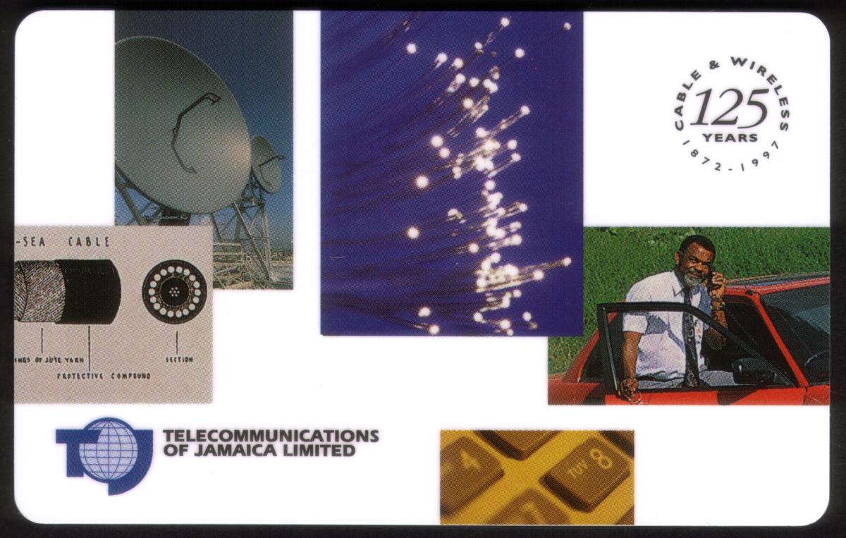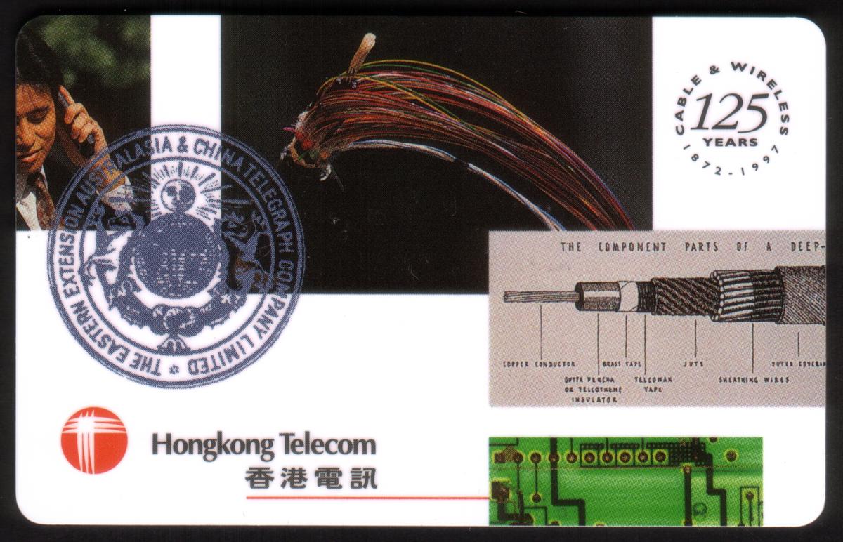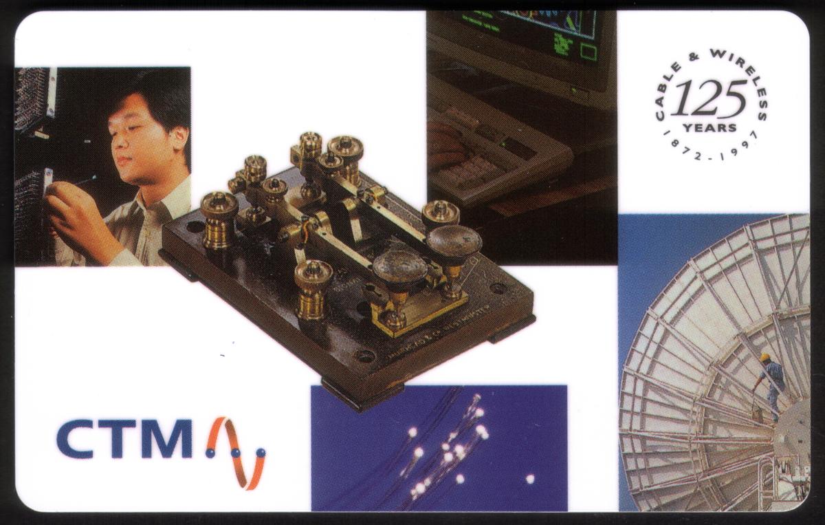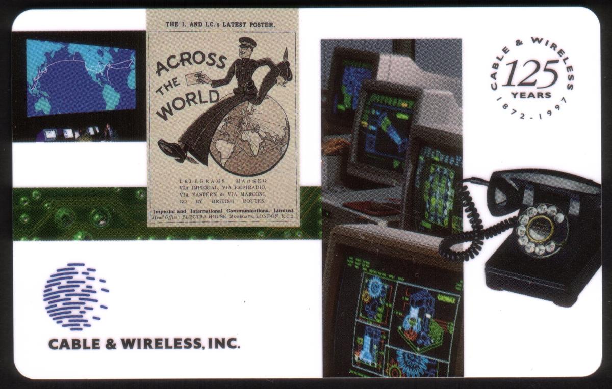 This card reflects Cable & Wireless's global telecommunications influence, connecting historical maritime communication to modern satellite technology, and highlights its operations in locations including Hong Kong, Macau, and Jamaica.