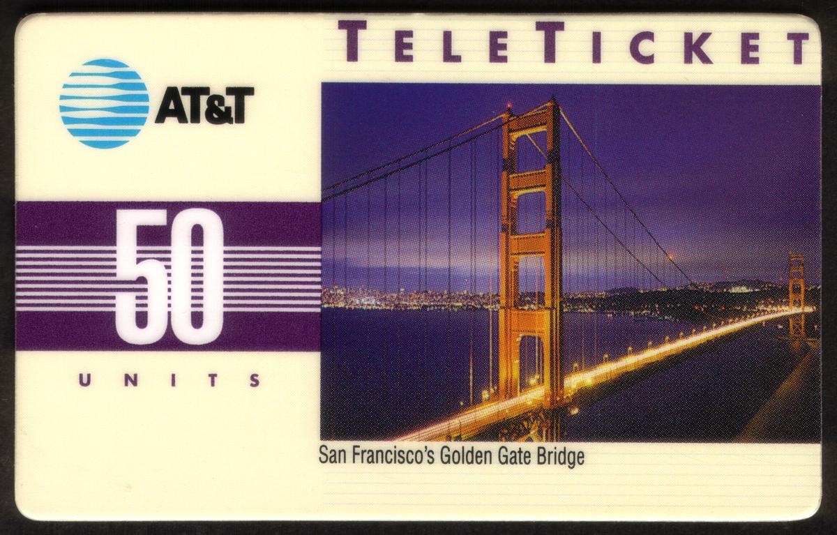 Text on the card identifies it as part of the "San Francisco's Golden Gate Bridge (Group 3)" series and includes French language, indicating bilingual or international use. The card is issued by AT&T under the Teleticket brand, a well-known provider of collectible phone cards. Additional printed details include "gr3 50u," suggesting the card’s group and unit value.