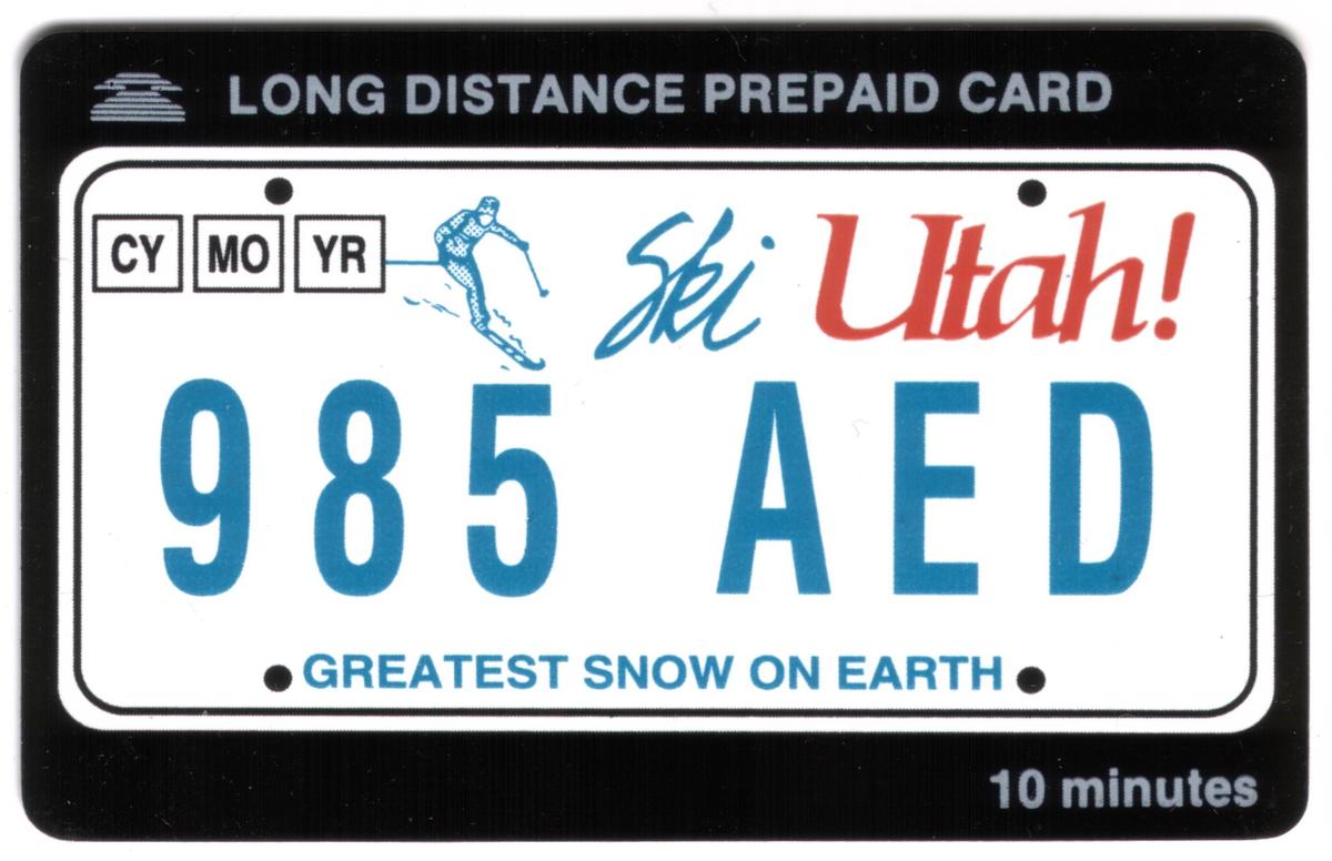 The card includes distinctive text referencing Utah’s famous snow conditions with the slogan "Greatest Snow On Earth." The imagery and wording underline Utah’s reputation as a premier skiing destination within the United States. Above the skier, there is a blue license plate graphic that states “Utah,” reinforcing the geographical theme of this collectible card.
