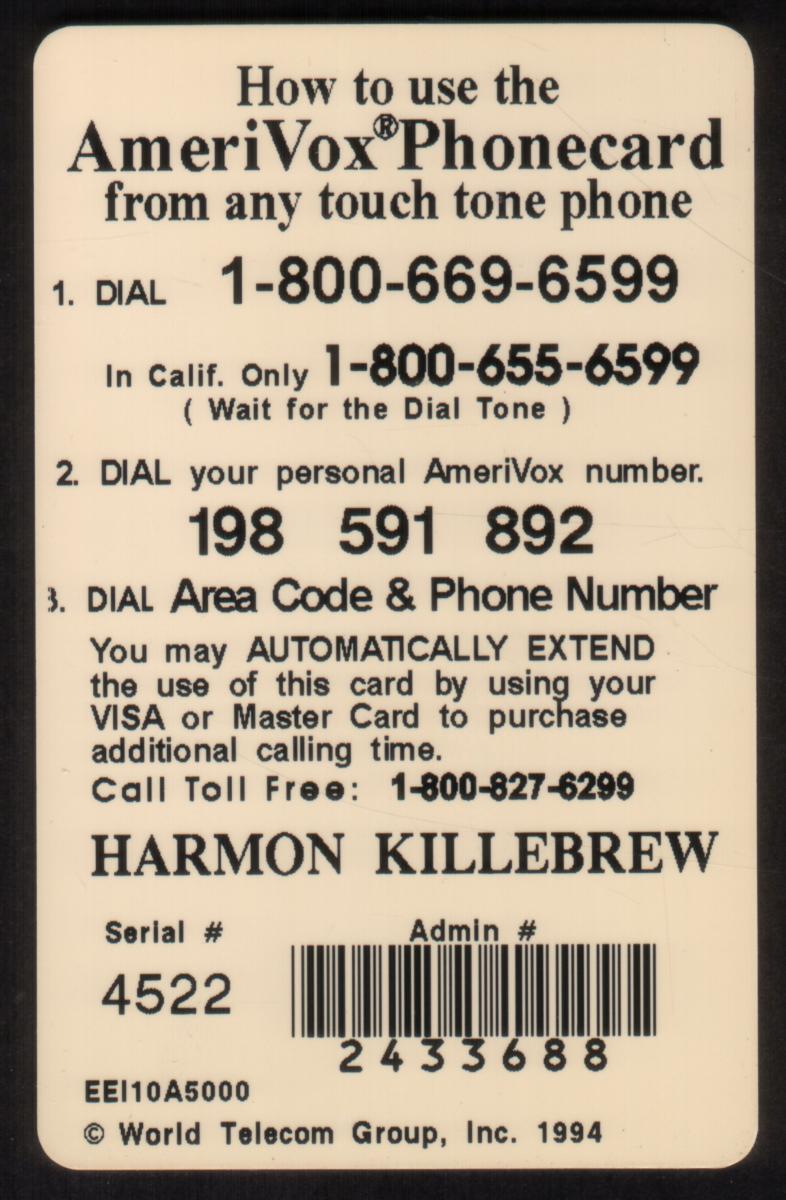 The card includes the AmeriVox logo at the top left corner, accompanied by the small text tagline "The World's New Voice in Calling." Harmon Killebrew’s signature appears in red script across the bottom center of the card. The denomination "$10" is printed in bold black and orange at the lower right corner.