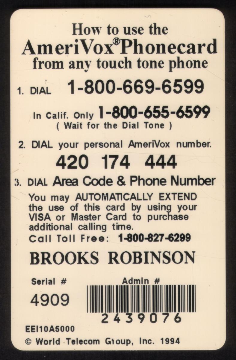 The card includes the AmeriVox logo in the upper right corner beside an American flag and a Statue of Liberty graphic. Brooks Robinson’s signature is printed in red near the bottom left, above the $10 denomination marked in bold red on the lower right corner. The overall design emphasizes Robinson’s status as one of baseball’s iconic figures.