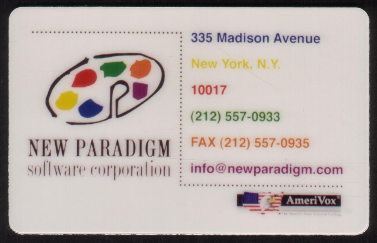 The collectible card features a corporate business design centered around the New Paradigm Software Corporation based in New York. The card’s visual elements highlight themes of computer technology and computer software, incorporating an artistic style with a modern, digital aesthetic. Prominently displayed are the words "New Paradigm Software Corporation" alongside the location "New York," reinforcing the identity of the corporation.