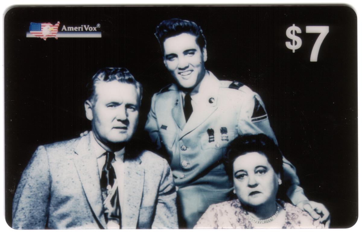 This collectible phone card features a black-and-white photograph of Elvis Presley dressed in a United States military uniform, standing between his parents, Gladys and Vernon Presley. The image is from 1958, capturing a moment from Elvis’s time in uniform, reflecting his service in the military. Elvis wears a dress uniform cap and jacket with visible insignia, presenting a formal and composed appearance.