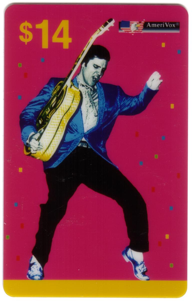 Vibrant Elvis Presley image on magenta background with bold $14 denomination, colorful accents, and AmeriVox branding, celebrating music icon and vintage telecom.