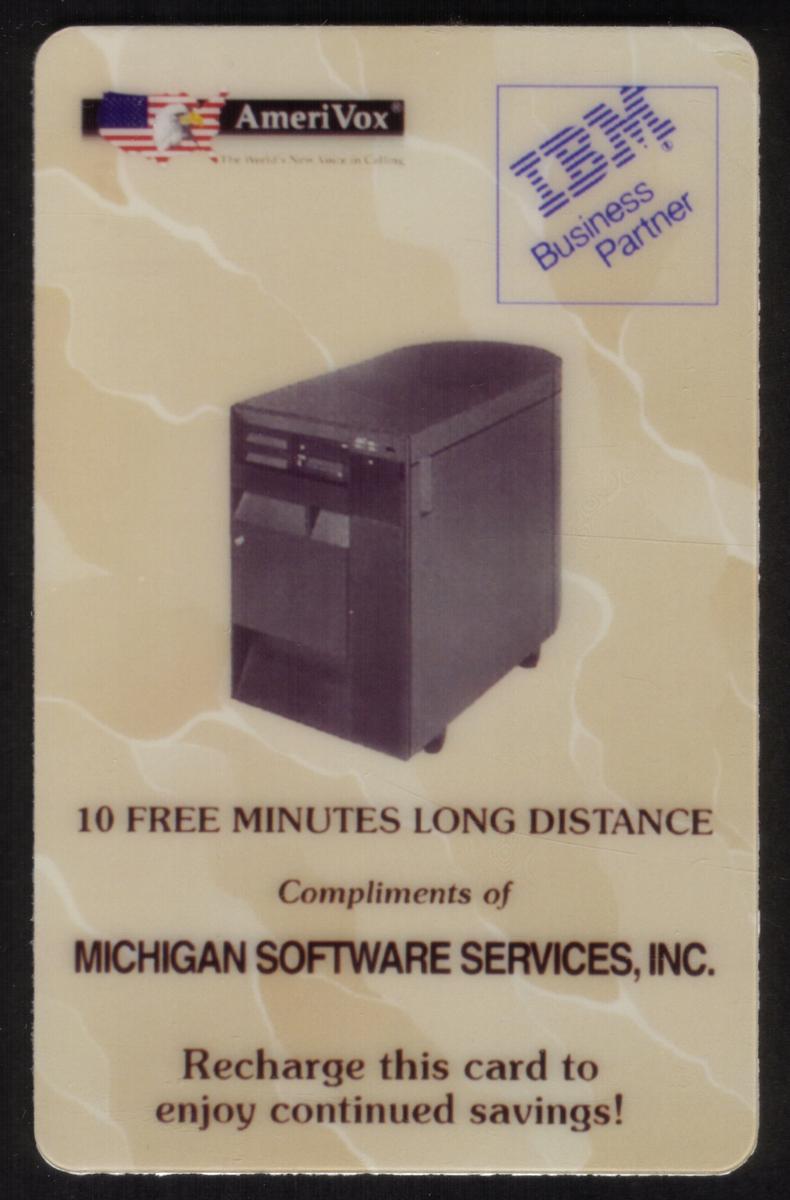 Michigan Software Services promotional card featuring IBM, AmeriVox logos, 10 free minutes, and vintage tech branding for long-distance calls.