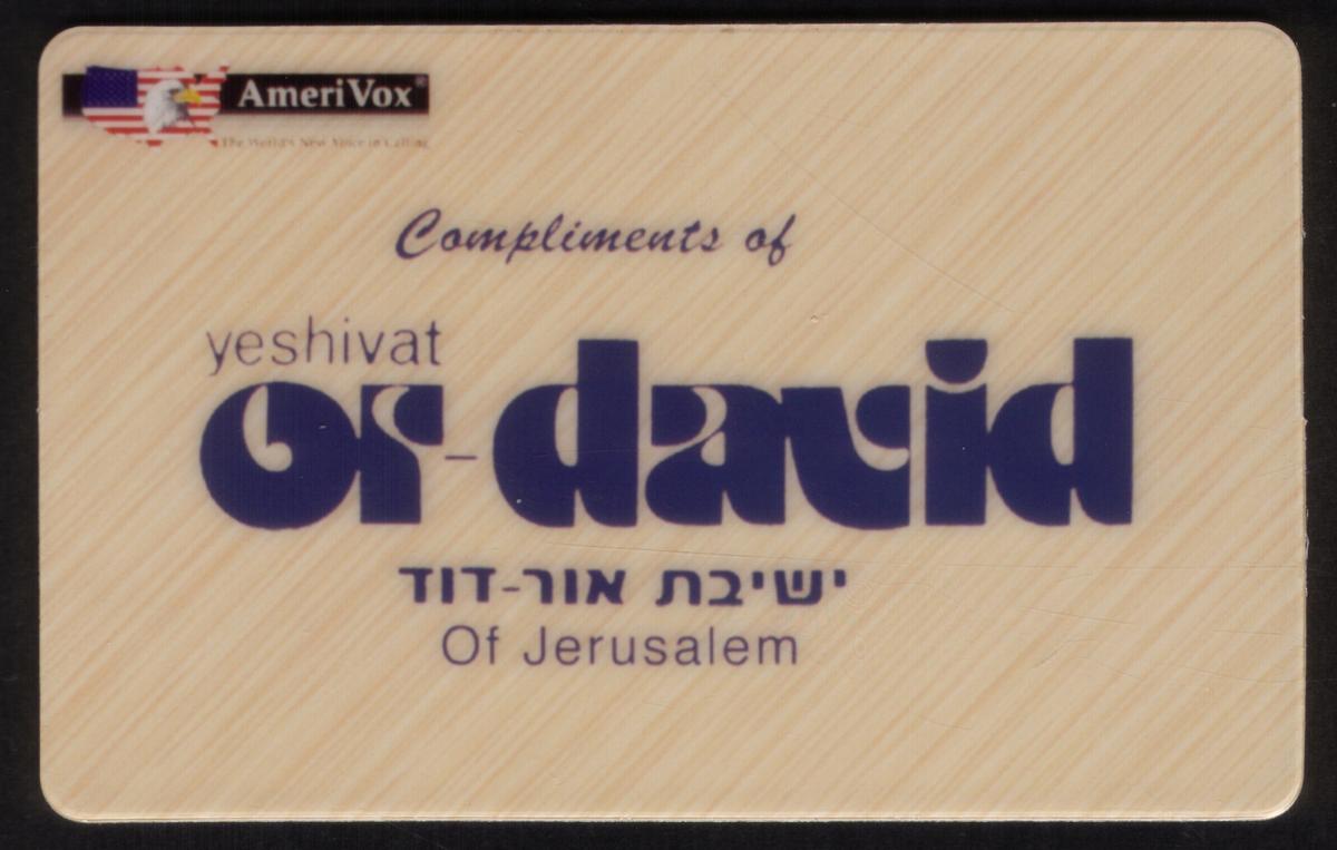 Text near the bottom further specifies that this is a “Complimentary Promo” issued by AmeriVox, marking it as a promotional item linked to a Jewish school. The overall design communicates themes of Judaism, peace, and education tied to the Yeshivat of David in Jerusalem, combining sacred symbols like the Star of David and peace doves with a bright and hopeful rainbow backdrop.