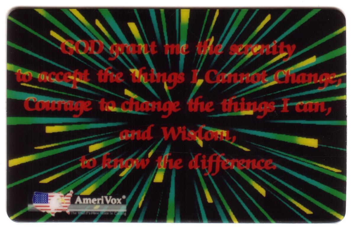 The card includes the word "PROOF" and the name "AmeriVox," indicating the issuer or publisher. Its design aligns with themes of religion, faith, and personal growth tied to the twelve-step recovery movement. The spiritual message emphasizes serenity, courage, and wisdom—key concepts embraced by Christianity and the Alcoholics Anonymous program.