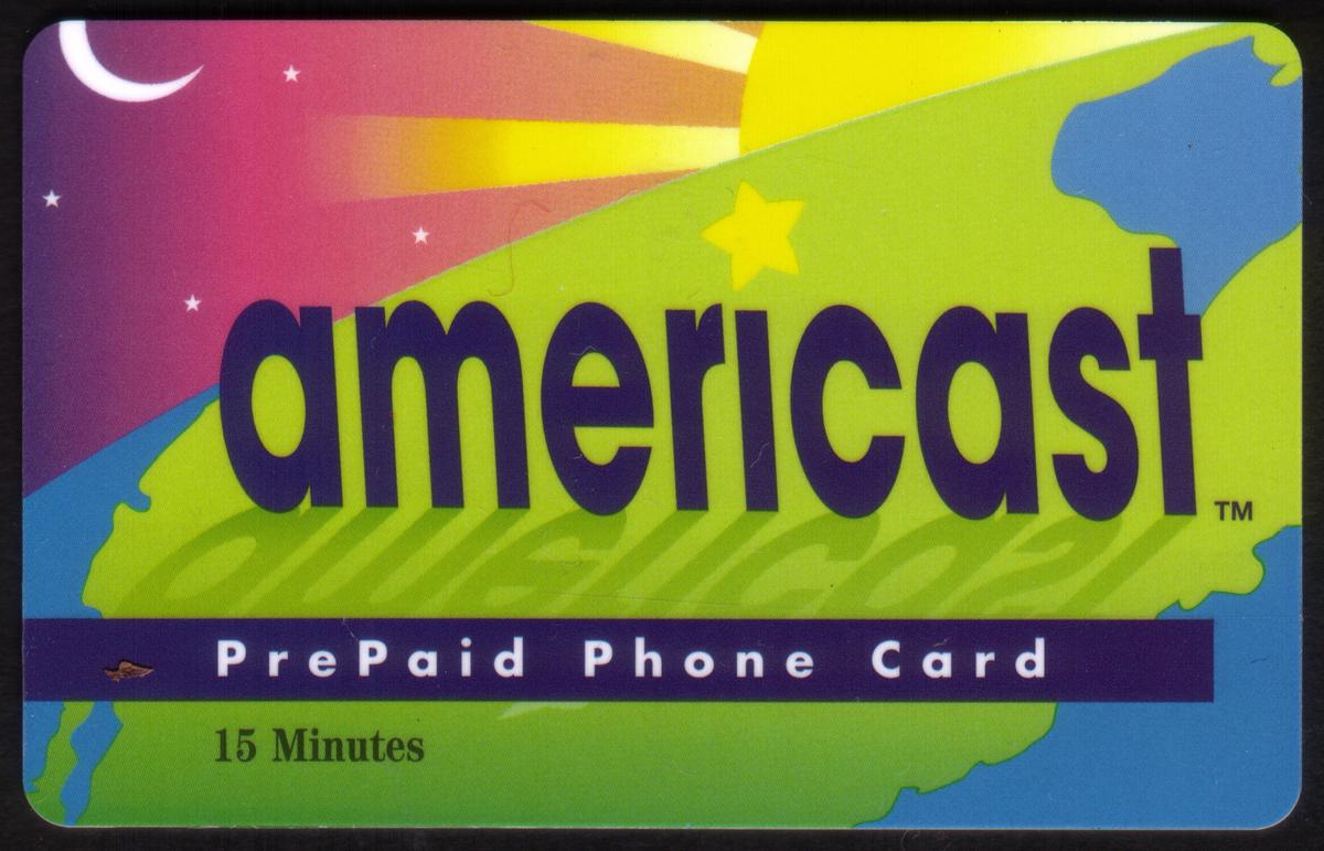 The card size is consistent with collectible phone cards, measuring approximately 15 meters in length as indicated by the wording "15m" on the card. It is labeled as a specimen, suggesting it was issued for demonstration or promotional purposes rather than regular commercial use. The overall design integrates elements related to telecommunications, such as the Americast logo and space-themed graphics featuring the moon and stars.