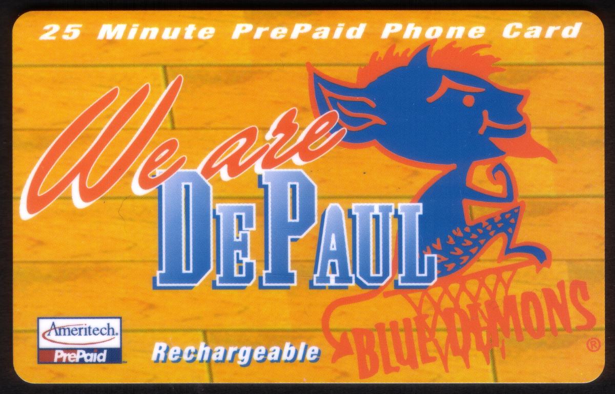 This collectible prepaid phone card celebrates DePaul University’s Blue Demons, incorporating sports and school spirit with clear, colorful graphics focused on basketball and university identity.