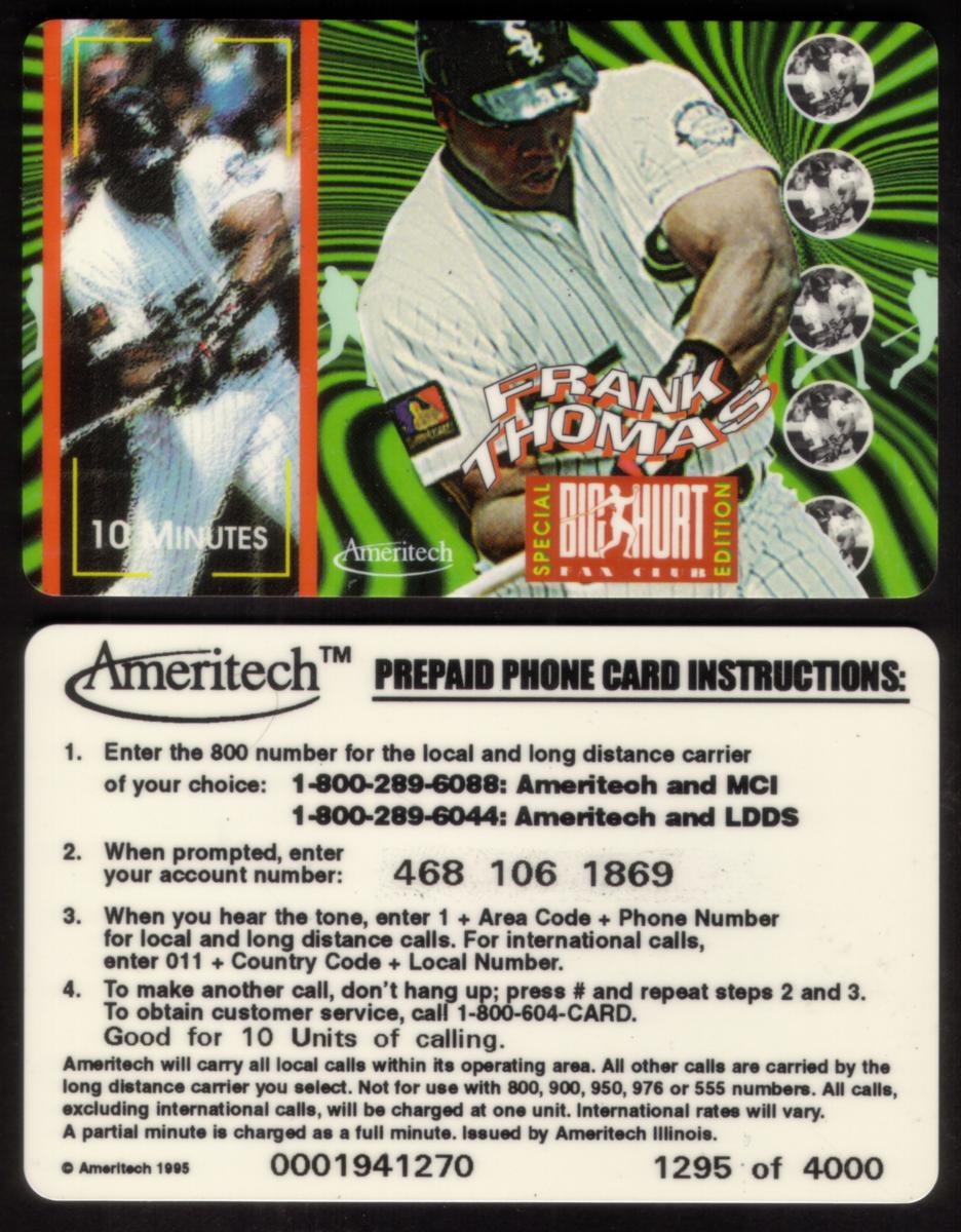 Text on the card includes "Frank Thomas," "Big Hurt," and "Special Edition" prominently displayed across the center. The bottom left corner states the card value as "10 Minutes," indicating its usability for phone calls. The brand "Ameritech" is printed near the bottom left area, signifying the phone company associated with this card. The overall design emphasizes Frank Thomas's reputation and importance as a Chicago White Sox baseball player.