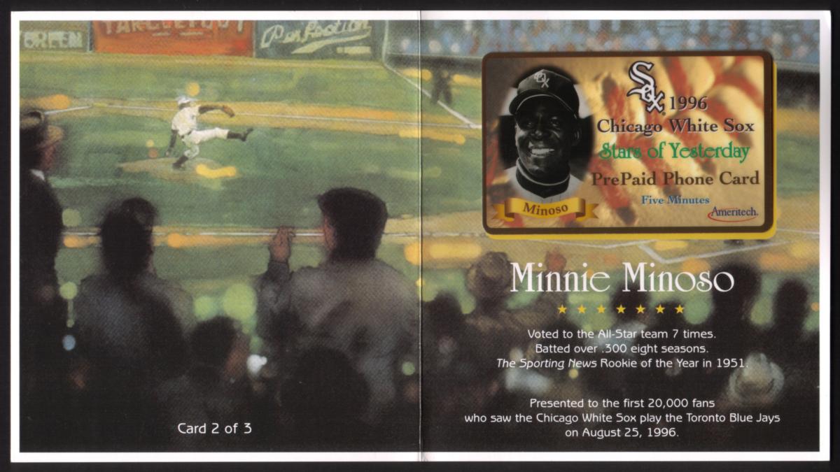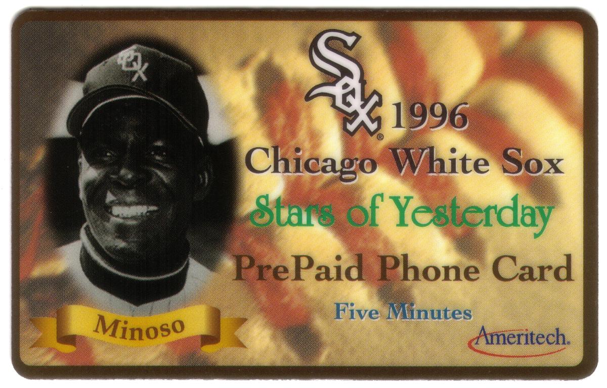This collectible prepaid phone card features Minnie Minoso, a baseball legend associated with the Chicago White Sox. The card is from 1996 and part of the "Stars of Yesterday" series celebrating famous sports figures and baseball stars of previous generations. The design includes a smiling portrait of Minoso wearing a Chicago White Sox cap and uniform.
