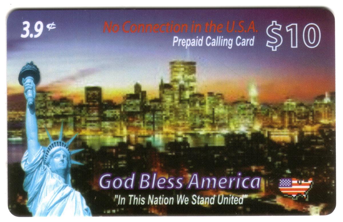 Prepaid card featuring NYC skyline with Twin Towers, Statue of Liberty, patriotic messages, $10 value, 3.9¢/min rate, historic American symbols. |