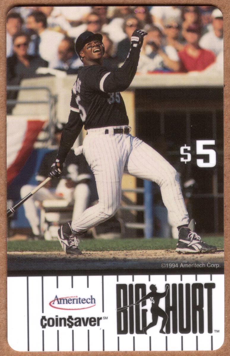 The card has a $5 denomination prominently displayed on the right side. The lower portion contains branding and design elements, including the Ameritech logo, the words "coin$aver" and "Big Hurt" with a silhouette of a batter incorporated into the text. The design uses a black, white, and gray color scheme with pinstripes resembling a baseball uniform pattern.